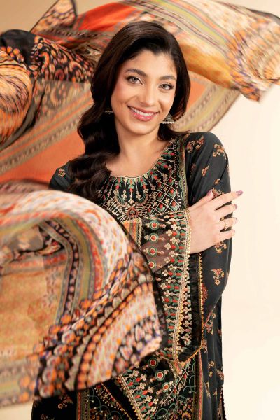 Define your signature style with this elegant digital printed embroidered three-piece creation from the latest unstitched summer collection.